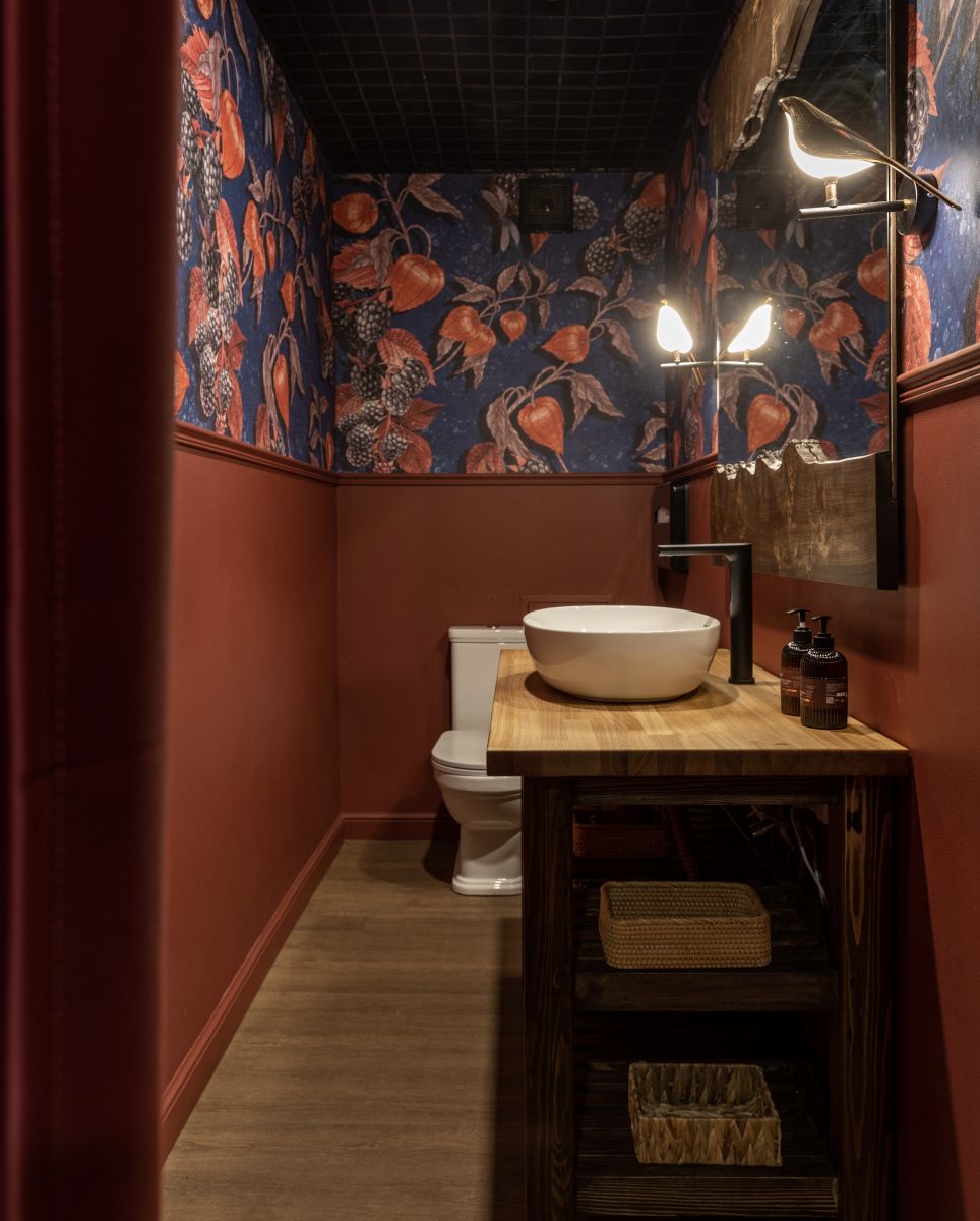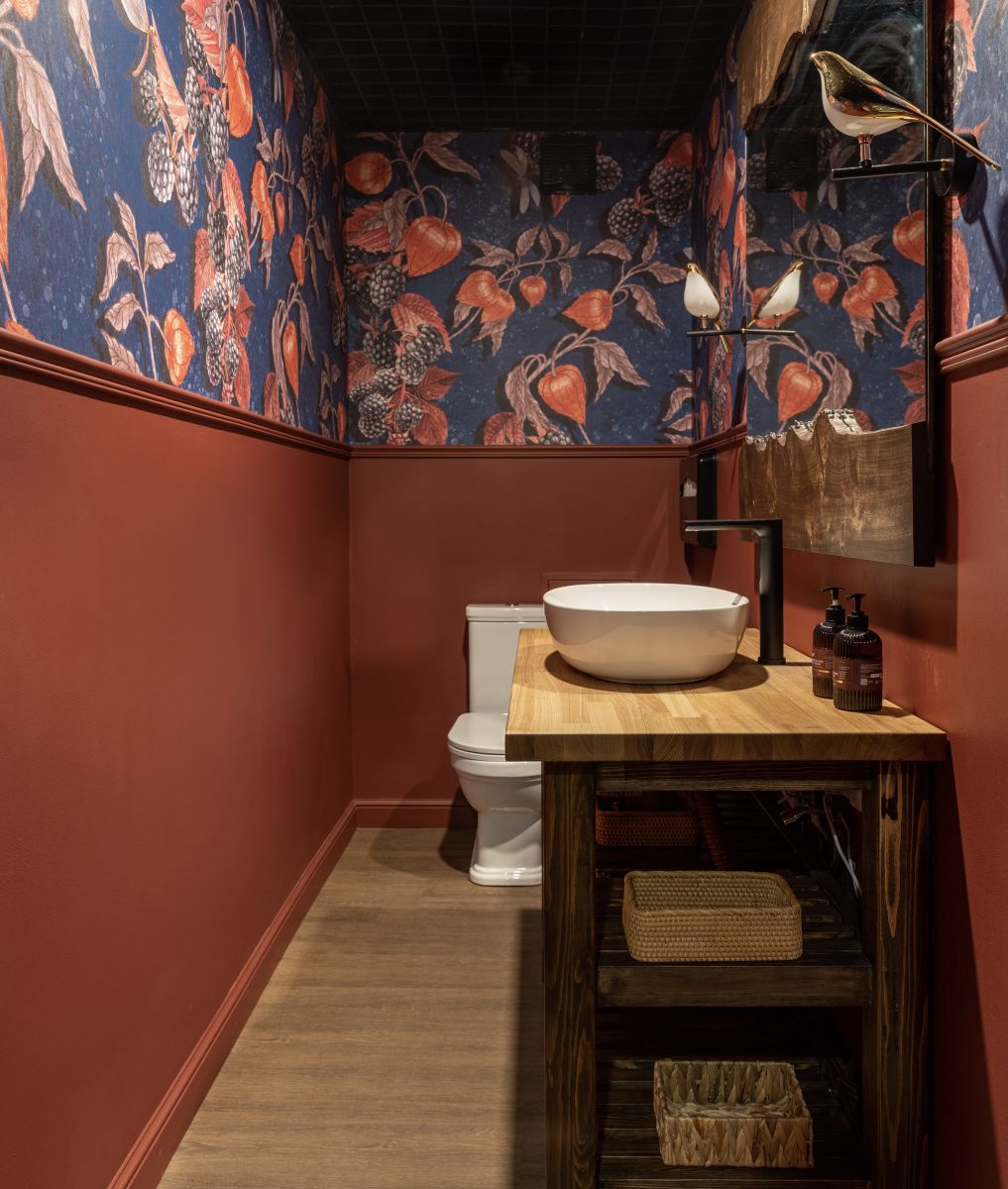 Красивый санузел - это показатель уровня сервиса и общей атмосферы заведения. Именно такой подход выбрала дизайнер Екатерина Ефремова, преобразив пространство ресторана «Винный Грот» в Самаре. Благодаря бесшовным обоям ECO с изображением (Арт. 35149) физалисов из дизайнерской коллекции «Enjoy» от ОРТОГРАФ, санузел заиграл новыми красками.